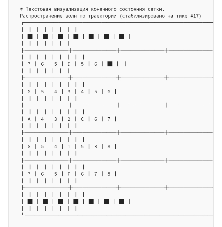 Инициализация сетки: Создается сетка из «ячеек-агентов», каждая из которых имеет простой тип (например, OBSTACLE, EMPTY) и состояние (например, значение).