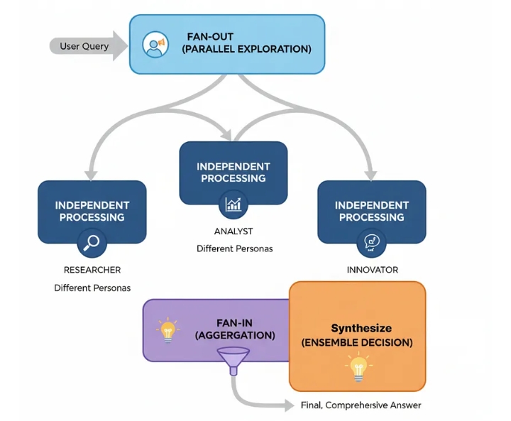 Параллельное исследование (Fan-Out): Запрос пользователя одновременно отправляется нескольким агентам-специалистам. Этим агентам назначаются разные роли, чтобы стимулировать нестандартное мышление.