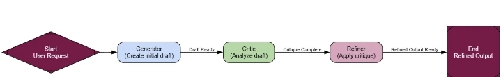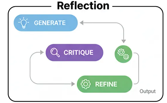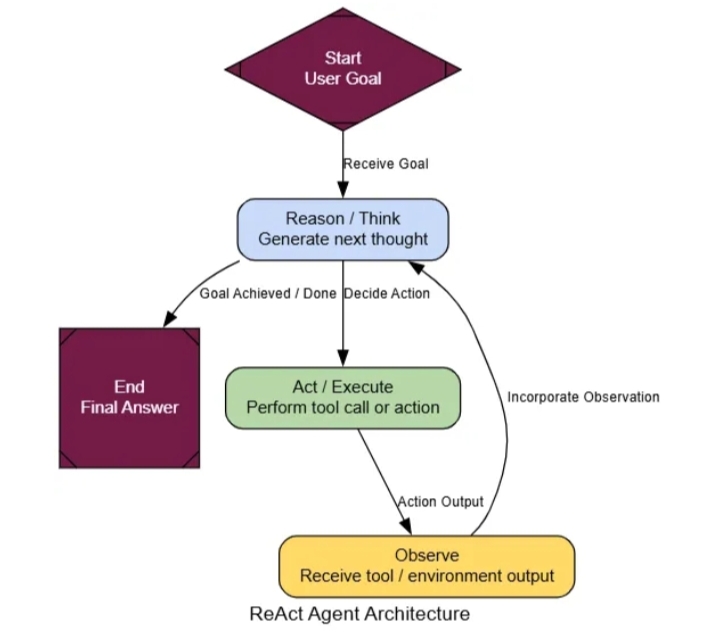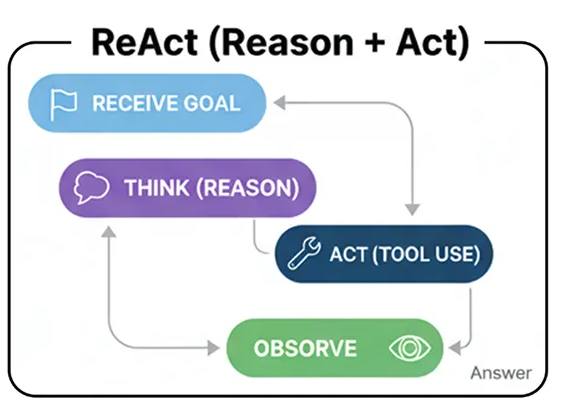 - Цикл ReAct , в котором агент попеременно думает, предпринимает действия, а затем снова думает, чтобы усовершенствовать свой процесс.